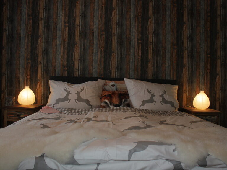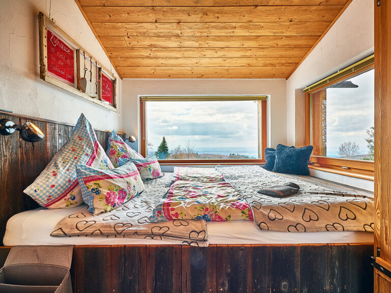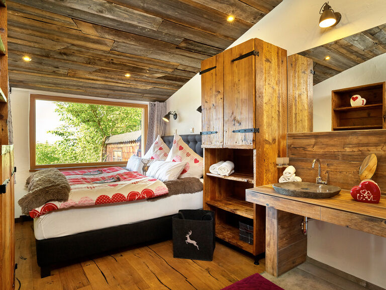 - Das Doppelbett direkt am Panoramafenster macht dieses Chalet mit Bergblick zu einem besonderen Rückzugsort – einschlafen und aufwachen mit freiem Blick in die Natur