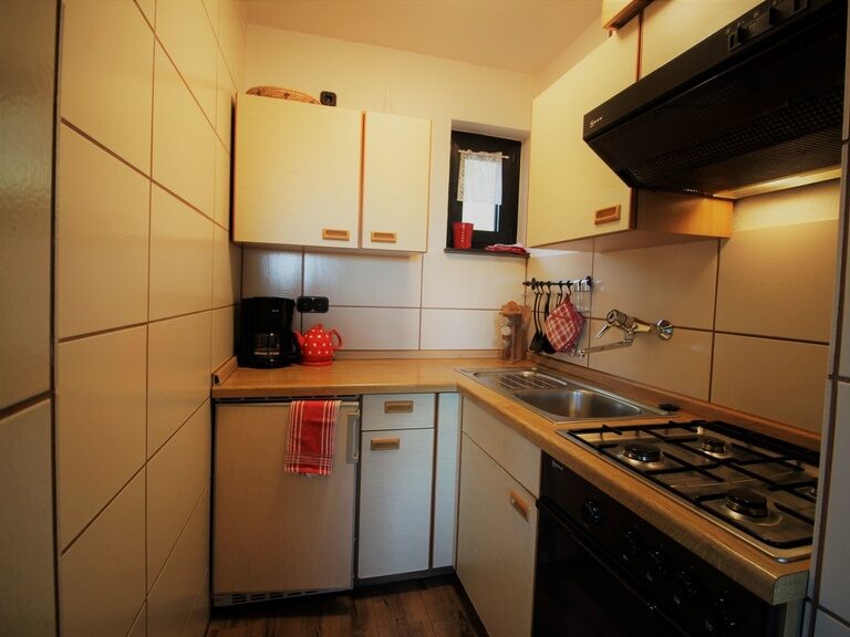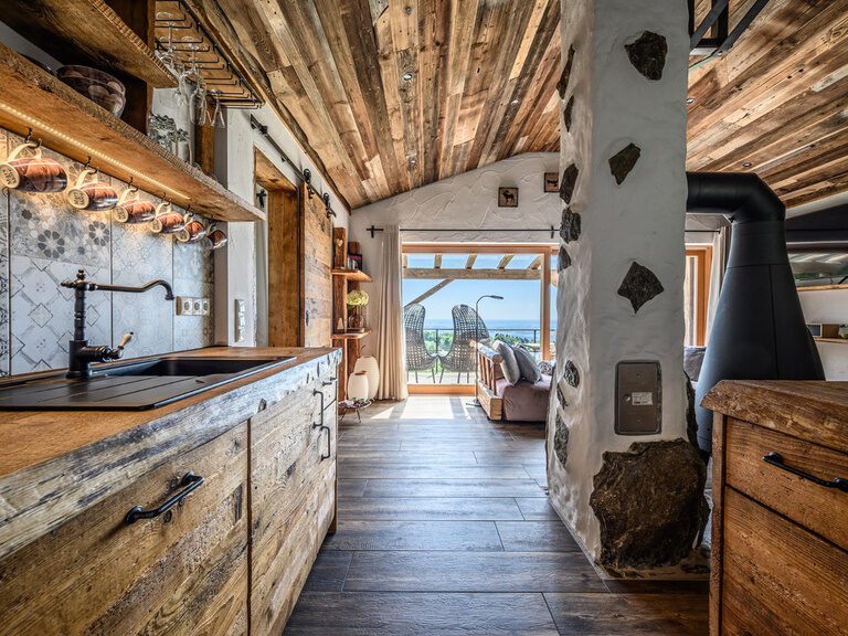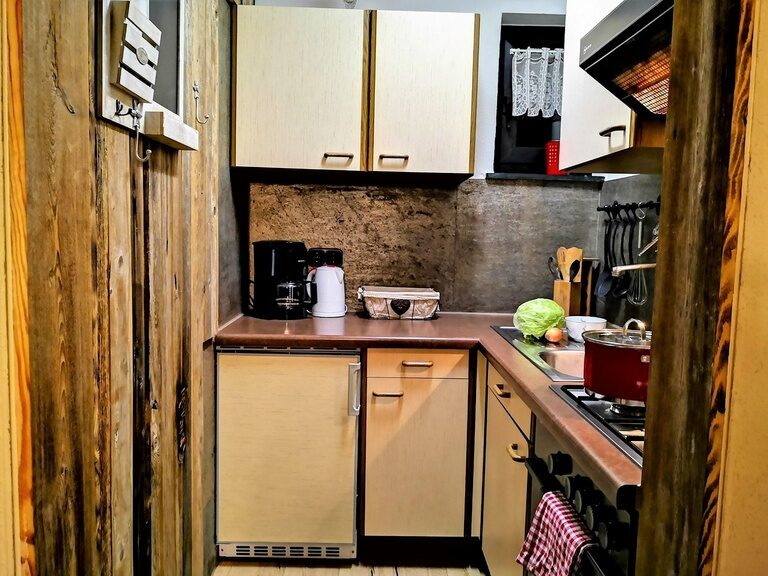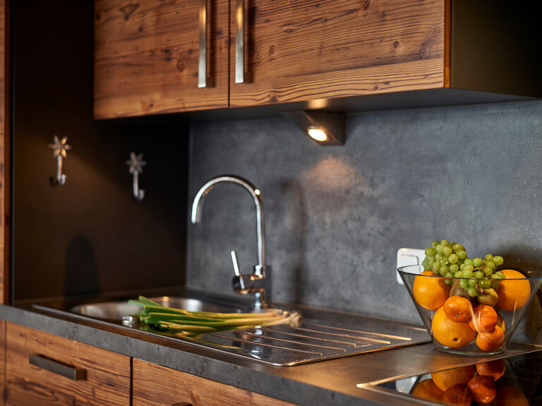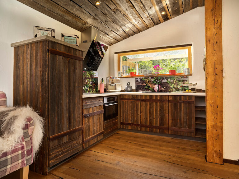 - Die offene Küche mit großzügiger Kücheninsel aus massivem Altholz lädt zum gemeinsamen Kochen ein. Ausgestattet mit Backofen, Spülmaschine, Kühlschrank mit Gefrierfach, Espressomaschine, Toaster und Wasserkocher bietet sie höchsten Komfort für Ihren Aufenthalt